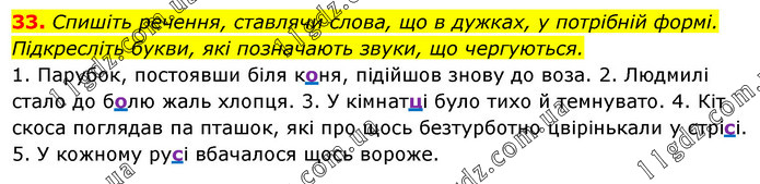 Спишіть речення, ставлячи слова, що в дужках, у потрібній формі. Підкресліть букви, які позначають звуки, що чергуються. 1. Парубок, постоявши біля коня, підійшов знову до воза. 2. Людмилі стало до болю жаль хлопця. 3. У кімнатці було тихо й темнувато. 4. Кіт скоса поглядав па пташок, які про щось безтурботно цвірінькали у стрісі. 5. У кожному русі вбачалося щось вороже.