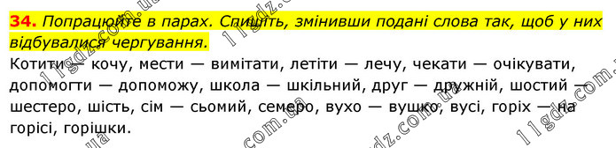 Попрацюйте в парах. Спишіть, змінивши подані слова так, щоб у них відбувалися чергування. Котити — кочу, мести — вимітати, летіти — лечу, чекати — очікувати, допомогти — допоможу, школа — шкільний, друг — дружній, шостий — шестеро, шість, сім — сьомий, семеро, вухо — вушко, вусі, горіх — на горісі, горішки.