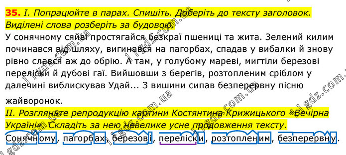 І. Попрацюйте в парах. Спишіть. Доберіть до тексту заголовок. Виділені слова розберіть за будовою. У сонячному сяйві простягайся безкраї пшениці та жита. Зелений килим починався від шляху, вигинався на пагорбах, спадав у вибалки й знову рівно слався аж до обрію. А там, у голубому мареві, мигтіли березові переліски й дубові гаї. Вийшовши з берегів, розтопленим сріблом у далечині виблискував Удай... З вишини сипав безперервну пісню жайворонок. II. Розгляньте репродукцію картини Костянтина Крижицького «Вечірна Україні». Складіть за нею невелике усне продовження тексту. Сонячному, пагорбах, березові, переліски, розтопленим, безперервну.