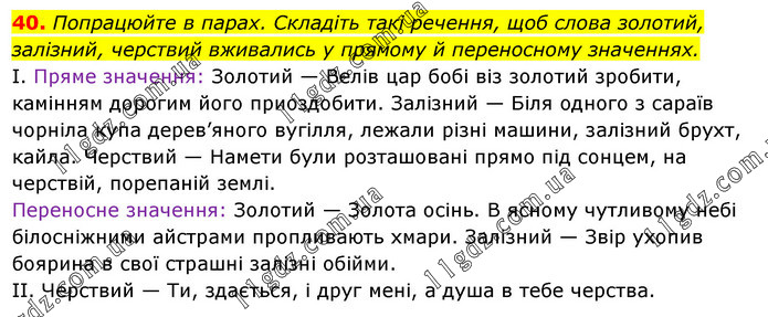 Попрацюйте в парах. Складіть такі речення, щоб слова золотий, залізний, черствий вживались у прямому й переносному значеннях. І. Пряме значення: Золотий — Велів цар бобі віз золотий зробити, камінням дорогим його приоздобити. Залізний — Біля одного з сараїв чорніла купа дерев’яного вугілля, лежали різні машини, залізний брухт, кайла. Черствий — Намети були розташовані прямо під сонцем, на черствій, порепаній землі. Переносне значення: Золотий — Золота осінь. В ясному чутливому небі білосніжними айстрами пропливають хмари. Залізний — Звір ухопив боярина в свої страшні залізні обійми. II. Черствий — Ти, здається, і друг мені, а душа в тебе черства.
