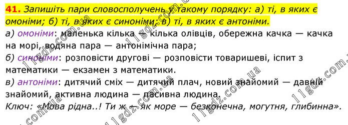 Запишіть пари словосполучень у такому порядку: а) ті, в яких є омоніми; б) ті, в яких є синоніми; в) ті, в яких є антоніми. а) омоніми: маленька кілька — кілька олівців, обережна качка — качка на морі, водяна пара — антонімічна пара; б) синоніми: розповісти другові — розповісти товаришеві, іспит з математики — екзамен з математики. в) антоніми: дитячий сміх — дитячий плач, новий знайомий — давній знайомий, активна людина — пасивна людина. Ключ: «Мова рідна..! Ти ж — як море — безконечна, могутня, глибинна».
