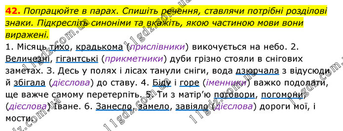 Попрацюйте в парах. Спишіть речення, ставлячи потрібні розділові знаки. Підкресліть синоніми та вкажіть, якою частиною мови вони виражені. 1. Місяць тихо, крадькома (прислівники) викочується на небо. 2. Величезні, гігантські (прикметники) дуби грізно стояли в снігових заметах. З. Десь у полях і лісах танули сніги, вода дзюрчала з відусюди й збігала (дієслова) до ставу. 4. Біду і горе (іменники) важко подолати, ще важче самому перетерпіть. 5. Ти з матір’ю поговори, погомони, (дієслова) Іване. 6. Занесло, замело, завіяло (дієслова) дороги мої, і мости.
