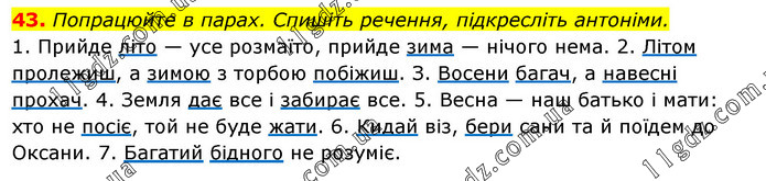 Попрацюйте в парах. Спишіть речення, підкресліть антоніми. 1. Прийде літо — усе розмаїто, прийде зима — нічого нема. 2. Літом пролежиш, а зимою з торбою побіжиш. З. Восени багач, а навесні прохач. 4. Земля дає все і забирає все. 5. Весна — наш батько і мати: хто не посіє, той не буде жати. 6. Кидай віз, бери сани та й поїдем до Оксани. 7. Багатий бідного не розуміє.
