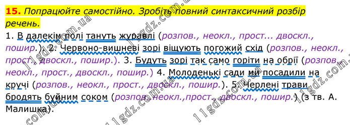 Попрацюйте самостійно. Зробіть повний синтаксичний розбір речень. 1. В далекім полі тануть журавлі (розпов., неокл., прост... двоскл., пошир.). 2. Червоно-вишневі зорі віщують погожий схід (розпов., неокл., прост., двоскл., пошир.). 3. Будуть зорі так само горіти на обрії (розпов., неокл., прост., двоскл., пошир.) 4. Молоденькі сади ми посадили на кручі (розпов., неокл., прост., двоскл., пошир.). 5. Черлені трави бродять буйним соком (розпов..неокл.,прост., двоскл., пошир.) (з тв. А. Малишка).