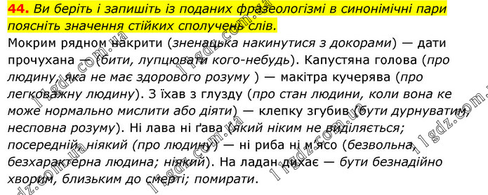 Ви беріть і запишіть із поданих фразеологізмі в синонімічні пари поясніть значення стійких сполучень слів. Мокрим рядном накрити (зненацька накинутися з докорами) — дати прочухана — (бити, лупцювати кого-небудь). Капустяна голова (про людину, яка не має здорового розуму ) — макітра кучерява (про легковажну людину). З їхав з глузду (про стан людини, коли вона ке може нормально мислити або діяти) — клепку згубив (бути дурнуватим, несповна розуму). Ні лава ні ґава (який ніким не виділяється; посередній, ніякий (про людину) — ні риба ні м’ясо (безвольна, безхарактерна людина; ніякий). На ладан дихає — бути безнадійно хворим, близьким до смерті; помирати.