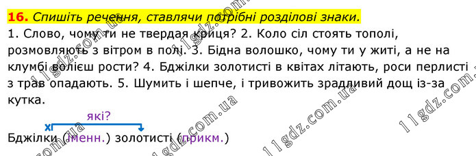 Спишіть речення, ставлячи потрібні розділові знаки. 1. Слово, чому ти не твердая криця? 2. Коло сіл стоять тополі, розмовляють з вітром в полі. 3. Бідна волошко, чому ти у житі, а не на клумбі волієш рости? 4. Бджілки золотисті в квітах літають, роси перлисті з трав опадають. 5. Шумить і шепче, і тривожить зрадливий дощ із-за кутка. які? Бджілки (іменн.) золотисті (прикм.)