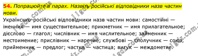Попрацюйте в парах. Назвіть російські відповідники назв частин мови. Українсько-російські відповідники назв частин мови: самостійні — іменник — имя существительное; прикметник — имя прилагательное; дієслово — глагол; числівник — имя числительное; займенник — местоимение; прислівник — наречие; службові — сполучник — союз, прийменник — предлог; частка — частица; вигук — междометие.