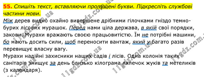 Спишіть текст, вставляючи пропущені букви. Підкресліть службові частини мови. Між дерев видно охайно вивершене дрібними гілочками гніздо темно-бурих лісових мурашок. Перед нами ціла держава, в якій свої порядки, закови. Мурахи вражають своєю працьовитістю. Їм не потрібні машини, бо мають досить сили, щоб переносити вантаж, який у багато разів перевищує власну вагу. Мурахи надійні захисники наших садів і лісів. Одна колонія таких санітарів знищує за день близько кілограма лялечок жуків та метеликів (з календаря).