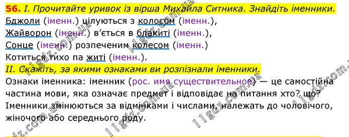 І. Прочитайте уривок із вірша Михайла Ситника. Знайдіть іменники. Бджоли (іменн.) цілуються з колосом (іменн.), Жайворон (іменн.) в’ється в блакиті (іменн.), Сонце (іменн.) розпеченим колесом (іменн.) Котиться тихо па житі (іменн.). II. Скажіть, за якими ознаками ви розпізнали іменники. Ознаки іменника: іменник (рос. имя существительное) — це самостійна частина мови, яка означає предмет і відповідає на питання хто? що? Іменники змінюються за відмінками і числами, належать до чоловічого, жіночого або середнього роду.