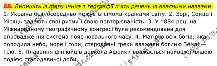 Випишіть із підручника з географії п'ять речень із власними назвами. 1. Україна безпосередньо межує із сімома країнами світу. 2. Зорі, Сонце і Місяць задають свої ритми і свою повторюваність. 3. У 1884 році на Міжнародному географічному конгресі була рекомендована для впровадження система пояснювального часу. 4. Матір’ю всіх богів, яка породила небо, море і гори, стародавні греки вважали богиню Землі — Гею. 5. Плавання фінікійців довкола Африки вважається найважливішою подією стародавньої доби.