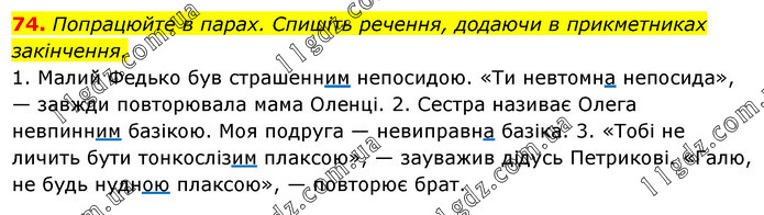 Попрацюйте в парах. Спишіть речення, додаючи в прикметниках закінчення. 1. Малий Федько був страшенним непосидою. «Ти невтомна непосида», — завжди повторювала мама Оленці. 2. Сестра називає Олега невпинним базікою. Моя подруга — невиправна базіка. 3. «Тобі не личить бути тонкослізим плаксою», — зауважив дідусь Петрикові. «Галю, не будь нудною плаксою», — повторює брат.
