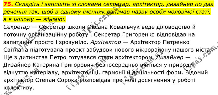 Складіть і запишіть зі словами секретар, архітектор, дизайнер по два речення так, щоб в одному іменник означав назву особи чоловічої статі, а в іншому — жіночої. Секретар — Секретар школи Оксана Ковальчук веде діловодство й поточну організаційну роботу . Секретар Григоренко відповідав на запитання просто і зрозуміло. Архітектор — Архітектор Петренко Світлана підготувала проект забудови нового мікрорайону нашого міста. Ще з дитинства Петро готувався стати архітектором. Дизайнер — Дизайнер Катерина Григорович безпосередньо вчиться у природи відчуттю матеріалу, архітектоніці, гармонії й доцільності форм. Відомий архітектор Степан Сорока розповідав про нові досягнення у роботі колективу.