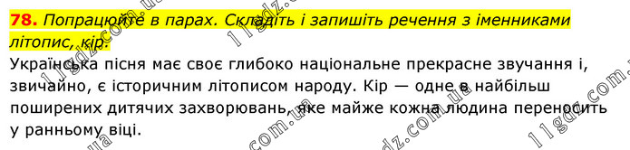 Попрацюйте в парах. Складіть і запишіть речення з іменниками літопис, кір. Українська пісня має своє глибоко національне прекрасне звучання і, звичайно, є історичним літописом народу. Кір — одне в найбільш поширених дитячих захворювань, яке майже кожна людина переносить у ранньому віці.