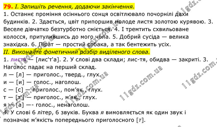 І. Запишіть речення, додаючи закінчення. 1. Останнє проміння осіннього сонця освітлювало почорнілі дахи будинків. 2. Здається, цвіт припоршив молоде листя золотою курявою. 3. Веселе дівчатко безтурботно сміється. 4. І тремтить схвильоване колосся, притулившись до мого чола. 5. Добрий сусіда — велика знахідка. 6. Пірат — простий собака, а так бентежить усіх. II. Виконайте фонетичний розбір виділеного слова. 1. листя — [лис'т'а]. 2. У слові два склади; лис-тя, обидва — закриті. 3. Наголос падає на перший склад. л — [л] — приголос., тверд., глух. и — [и] — голос., наголош. с — [с] — приголос., пом’як., глух. т — [т'] — приголос., м’як., глух. я — [а] —- голос., ненаголош. 4. У слові 6 літер, 6 звуків. Буква я вимовляється як один звук і позначає м’якість попереднього приголосного [т].