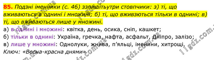 Подзні іменники (с. 46) ззпишітьутри стовпчики: з) ті, що вживаються в однині і множині; б) ті, що вживзються тільки в однині; в) ті, що вживаються лише у множині. а) в однині і множині: квітка, день, осика, сніп, кашкет; б) тільки в однині: Україна, гречка, нафта, асфальт, Дніпро, залізо; в) лише у множині: Однолуки, жнива, п’яльці, іменини, хитрощі. Ключ: «Весна-красна днями»