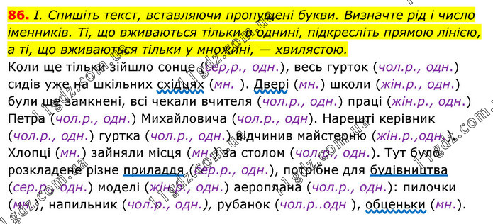 І. Спишіть текст, вставляючи пропущені букви. Визначте рід і число іменників. Ті, що вживаються тільки в однині, підкресліть прямою лінією, а ті, що вживаються тільки у множині, — хвилястою. Коли ще тільки зійшло сонце (сер,р., одн.), весь гурток (чол.р., одн.) сидів уже на шкільних східцях (мн. ). Двері (мн.) школи (жін.р., одн.) були ще замкнені, всі чекали вчителя (чол.р., одн.) праці (жін.р., одн.) Петра (чол.р., одн.) Михайловича (чол.р., одн). Нарешті керівник (чол.р., одн.) гуртка (чол.р., одн.) відчинив майстерню (жін.р.,одн.). Хлопці (мн.) зайняли місця (мн.) за столом (чол.р., одн.). Тут було розкладене різне приладдя (сер.р., одн.), потрібне для будівництва (сер.р., одн.) моделі (жін.р., одн.) аероплана (чол.р., одн.): пилочки (мн.), напильник (чол.р., одн.), рубанок (чол.р..одн ), обценьки (мн.).