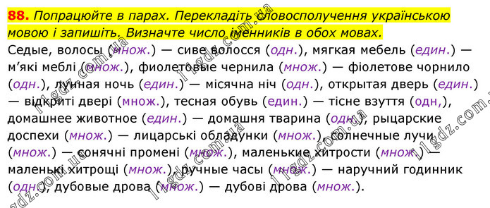 Попрацюйте в парах. Перекладіть словосполучення українською мовою і запишіть. Визначте число іменників в обох мовах. Седые, волосы (множ.) — сиве волосся (одн.), мягкая мебель (един.) — м’які меблі (множ.), фиолетовые чернила (множ.) — фіолетове чорнило (одн.), лунная ночь (един.) — місячна ніч (одн.), открытая дверь (един.) — відкриті двері (множ.), тесная обувь (един.) — тісне взуття (одн,), домашнее животное (един.) — домашня тварина (одн.), рыцарские доспехи (множ.) — лицарські обладунки (множ.), солнечные лучи (множ.) — сонячні промені (множ.), маленькие хитрости (множ.) — маленькі хитрощі (множ.), ручные часы (множ.) — наручний годинник (одн.), дубовые дрова (множ.) — дубові дрова (множ.).