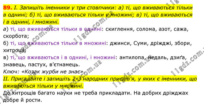 І. Запишіть іменники у три стовпчики: а) ті, що вживаються тільки в однині; б) ті, що вживаються тільки у множині; в) ті, що вживаються і в однині, і множині. а) ті, що вживаються тільки в однині: скиглення, солома, азот, сажа, скорбота; б) ті, що вживаються тільки в множині: джинси, Суми, дріжджі, збори, хитрощі; в) ті, що вживаються і в однині, і множині: антилопа, медаль, дзиґа, знавець, пастух, в’єтнамець. Ключ: «Козак журби не знає». II. Пригадайте і запишіть 2-3 народних прислів'я, у яких є іменники, що вживаються тільки у множині. До хитрощів багато науки не треба прикладати. На добрих дріжджах добре й рости.