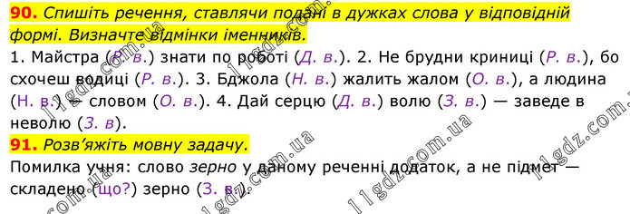 90. Спишіть речення, ставлячи подані в дужках слова у відповідній формі. Визначте відмінки іменників. 1. Майстра (Р. в.) знати по роботі (Д. в.). 2. Не брудни криниці (Р. в.), бо схочеш водиці (Р. в.). 3. Бджола (Н. в.) жалить жалом (О. в.), а людина (Н. в.) — словом (О. в.). 4. Дай серцю (Д. в.) волю (З. в.) — заведе в неволю (3. в). 91. Розв’яжіть мовну задачу. Помилка учня: слово зерно у даному реченні додаток, а не підмет — складено (що?) зерно (З. в.).