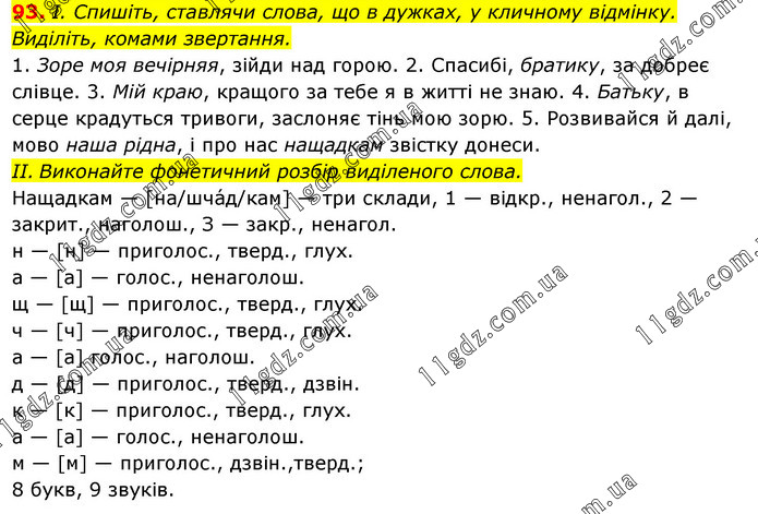 І. Спишіть, ставлячи слова, що в дужках, у кличному відмінку. Виділіть, комами звертання. 1. Зоре моя вечірняя, зійди над горою. 2. Спасибі, братику, за добреє слівце. 3. Мій краю, кращого за тебе я в житті не знаю. 4. Батьку, в серце крадуться тривоги, заслоняє тінь мою зорю. 5. Розвивайся й далі, мово наша рідна, і про нас нащадкам звістку донеси. IІ. Виконайте фонетичний розбір виділеного слова. Нащадкам — [на/шча́д/кам] — три склади, 1 — відкр., ненагол., 2 — закрит., наголош., З — закр., ненагол. н — [н] — приголос., тверд., глух. а — [а] — голос., ненаголош. щ — [щ] — приголос., тверд., глух. ч — [ч] — приголос., тверд., глух. а — [а] голос., наголош. д — [д] — приголос., тверд., дзвін. к — [к] — приголос., тверд., глух. а — [а] — голос., ненаголош. м — [м] — приголос., дзвін., тверд.; 8 букв, 9 звуків.