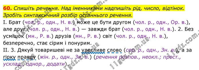 Спишіть речення. Над іменниками надпишіть рід, число, відтінок. Зробіть синтаксичний розбір останнього речення. І. Брат (чол. p., одн., Н. в.) може це бути другом (чол. p., одн., Ор. в.), але друг (чол. p., одн., Н. в.) — завжди брат (чол. p., одн., Н. в.). 2. Без усмішок (мн., Р. в.) друзів (мн., Р. в.) світ (чол. р., одн., Н. в.), безперечно, стає сірим і понурим. ІІ. 3. Дякуй товаришеві не за улесливе слово (сер. p., одн., Зн. в.), а за гірку правду (жін. p., одн., Зн. в.) (речення розпов., неокл.; прост., усклад., однор., додати).