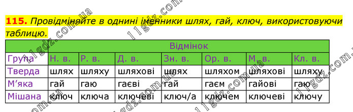 Провідміняйте в однині іменники шлях, гай, ключ, використовуючи таблицю. Відмінок Група Н. в. Р. в. Д. в. Зн. в. Ор. в. М. в. Кл. в. Тверда шлях шляху шляхові шлях шляхом шляхові шляху М’яка гай гаю гаєві гай гаєм гайові гаю Мішана ключ ключа ключеві ключ/а ключем ключеві ключу