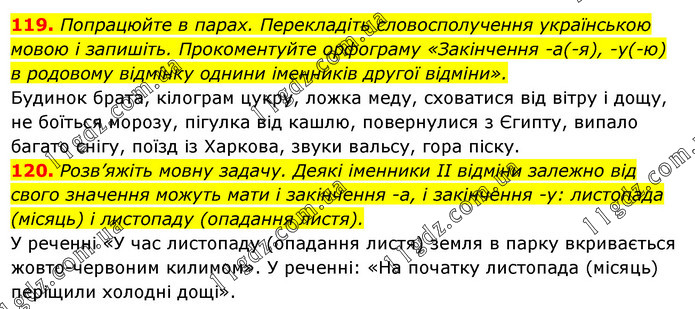 119. Попрацюйте в парах. Перекладіть словосполучення українською мовою і запишіть. Прокоментуйте орфограму «Закінчення -а(-я), -у(-ю) в родовому відмінку однини іменників другої відміни». Будинок брата, кілограм цукру, ложка меду, сховатися від вітру і дощу, не боїться морозу, пігулка від кашлю, повернулися з Єгипту, випало багато снігу, поїзд із Харкова, звуки вальсу, гора піску. 120. Розв’яжіть мовну задачу. Деякі іменники ІІ відміни залежно від свого значення можуть мати і закінчення -а, і закінчення -у: листопада (місяць) і листопаду (опадання листя). У реченні «У час листопаду (опадання листя) земля в парку вкривається жовто-червоним килимом». У реченні: «На початку листопада (місяць) періщили холодні дощі».