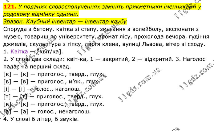 У поданих словосполученнях замініть прикметники іменниками у родовому відмінку однини. Зразок. Клубний інвентар — інвентар клубу Споруда з бетону, квітка зі степу, змагання з волейболу, експонати з музею, товариш по університету, аромат лісу, прохолода вечора, гудіння джмелів, скульптура з гіпсу, листя клена, вулиці Львова, вітер зі сходу. 1. Квітка — [кві́т/ка]. 2. У слові два склади: квіт-ка, 1 — закритий, 2 — відкритий. 3. Наголос падає на перший склад. [к] — [к] — приголос., тверд., глух. [в] — [в] — приголос., м’як., глух. [і] — [і] — голос., наголош. [т] — [т] — приголос., тверд., глух. [к] — [к] — приголос., тверд., глух. [а] — [а] — голос., ненаголош. 4. У слові 6 літер, 6 звуків.