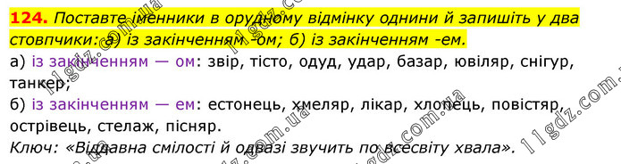 Поставте іменники в орудному відмінку однини й запишіть у два стовпчики: а) із закінченням -ом; б) із закінченням -ем. а) із закінченням — ом: звір, тісто, одуд, удар, базар, ювіляр, снігур, танкер; б) із закінченням — ем: естонець, хмеляр, лікар, хлопець, повістяр, острівець, стелаж, пісняр. Ключ: «Віддавна смілості й одвазі звучить по всесвіту хвала».