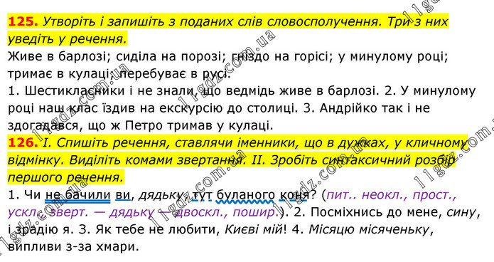 125. Утворіть і запишіть з поданих слів словосполучення. Три з них уведіть у речення. Живе в барлозі; сиділа на порозі; гніздо на горісі; у минулому році; тримає в кулаці; перебуває в русі. 1. Шестикласники і не знали, що ведмідь живе в барлозі. 2. У минулому році наш клас їздив на екскурсію до столиці. 3. Андрійко так і не здогадався, що ж Петро тримав у кулаці. 126. І. Спишіть речення, ставлячи іменники, що в дужках, у кличному відмінку. Виділіть комами звертання. ІІ. Зробіть синтаксичний розбір першого речення. 1. Чи не бачили ви, дядьку, тут буланого коня? (пит.. неокл., прост., ускл., зверт. — дядьку — двоскл., пошир.). 2. Посміхнись до мене, сину, і зрадію я. З. Як тебе не любити, Києві мій! 4. Місяцю місяченьку, випливи з-за хмари.