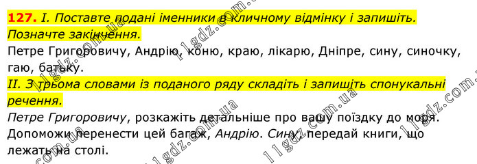 І. Поставте подані іменники в кличному відмінку і запишіть. Позначте закінчення. Петре Григоровичу, Андрію, коню, краю, лікарю, Дніпре, сину, синочку, гаю, батьку. II. З трьома словами із поданого ряду складіть і запишіть спонукальні речення. Петре Григоровичу, розкажіть детальніше про вашу поїздку до моря. Допоможи перенести цей багаж, Андрію. Сину, передай книги, що лежать на столі.