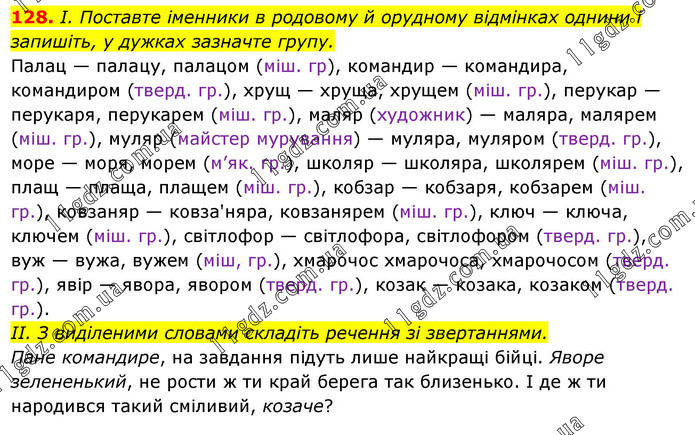 І. Поставте іменники в родовому й орудному відмінках однини і запишіть, у дужках зазначте групу. Палац — палацу, палацом (міш. гр), командир — командира, командиром (тверд. гр.), хрущ — хруща, хрущем (міш. гр.), перукар — перукаря, перукарем (міш. гр.), маляр (художник) — маляра, малярем (міш. гр.), муляр (майстер мурування) — муляра, муляром (тверд. гр.), море — моря, морем (м’як. гр.), школяр — школяра, школярем (міш. гр.), плащ — плаща, плащем (міш. гр.), кобзар — кобзаря, кобзарем (міш. гр.), ковзаняр — ковза'няра, ковзанярем (міш. гр.), ключ — ключа, ключем (міш. гр.), світлофор — світлофора, світлофором (тверд. гр.), вуж — вужа, вужем (міш, гр.), хмарочос хмарочоса, хмарочосом (тверд. гр.), явір — явора, явором (тверд. гр.), козак — козака, козаком (тверд. гр.). II. З виділеними словами складіть речення зі звертаннями. Пане командире, на завдання підуть лише найкращі бійці. Яворе зелененький, не рости ж ти край берега так близенько. І де ж ти народився такий сміливий, козаче?