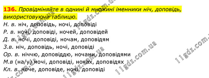 Провідміняйте в однині й множині іменники ніч, доповідь, використовуючи таблицю. Н. в. ніч, доповідь, ночі, доповіді Р. в. ночі, доповіді, ночей, доповідей Д. в. ночі, доповіді, ночам, доповідям 3.в. ніч, доповідь, ночі, доповіді Ор. в. ніччю, доповіддю, ночами, доповідями М.в (на/у) ночі, доповіді, ночах, доповідях Кл. в. ноче, доповіде, ночі, доповіді