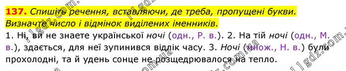 Спишіть речення, вставляючи, де треба, пропущені букви. Визначте число і відмінок виділених іменників. 1. Ні, ви не знаете української ночі (одн., Р. в.). 2. На тій ночі (одн., М. в.), здається, для неї зупинився відлік часу. 3. Ночі (множ., Н. в.) були прохолодні, та й удень сонце не розщедрювалося на тепло.