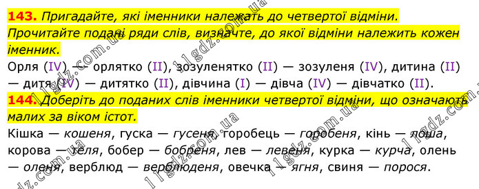 Пригадайте, які іменники належать до четвертої відміни. Прочитайте подані ряди слів, визначте, до якої відміни належить кожен іменник. Орля (IV) —- орлятко (II), зозуленятко (II) — зозуленя (IV), дитина (II) — дитя (IV) — дитятко (II), дівчина (І) — дівча (IV) — дівчатко (II). 144. Доберіть до поданих слів іменники четвертої відміни, що означають малих за віком істот. Кішка — кошеня, гуска — гусеня, горобець — горобеня, кінь — лоша, корова — теля, бобер — бобреня, лев — левеня, курка — курча, олень — оленя, верблюд — верблюденя, овечка — ягня, свиня — порося