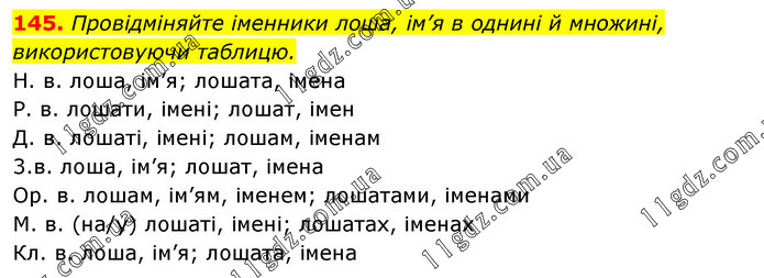 Провідміняйте іменники лоша, ім’я в однині й множині, використовуючи таблицю. Н. в. лоша, ім’я; лошата, імена Р. в. лошати, імені; лошат, імен Д. в. лошаті, імені; лошам, іменам 3.в. лоша, ім’я; лошат, імена Ор. в. лошам, ім’ям, іменем; лошатами, іменами М. в. (на/у) лошаті, імені; лошатах, іменах Кл. в. лоша, ім’я; лошата, імена