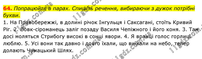 Попрацюйте в парах. Спишіть речення, вибираючи з дужок потрібні букви. 1. На Правобережжі, в долині річок Інгульця і Саксагані, стоїть Кривий Ріг. 2. Вовк-сіроманець заліг позаду Василя Чепіжного і його коня. 3. Там досі моляться Стрибогу високі в сонці явори. 4. Я вранці голос горлиці люблю. 5. Усі вони так давно і довго їхали, що виїхали на небо, тепер долають Чумацький Шлях.