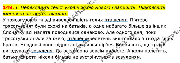 І. Перекладіть текст українською мовою і запишіть. Підкресліть іменники четвертої відміни. У трясогузок в гнізді вивелося шість голих пташенят. П’ятеро трясогузенят були схожі на батьків, а одне набагато більше за інших. Спочатку всі малята поводилися однаково. Але одного дня, поки трясогузки літали за їжею, пташеня-велетень виштовхало з гнізда своїх братів. Невдовзі воно підрослої вкрився пір’ям. Виявилось, що птахи вигодували зозуленя. До осені воно зовсім виросте. А коли полетить, батьки-сироти ніколи більше не зустрінуться із зозуленям.