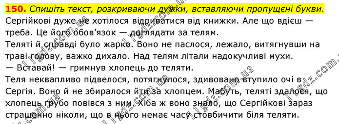 Спишіть текст, розкриваючи дужки, вставляючи пропущєні букви. Сергійкові дуже не хотілося відриватися від книжки. Але що вдієш — треба. Це його обов’язок — доглядати за телям. Теляті й справді було жарко. Воно не паслося, лежало, витягнувши на траві голову, важко дихало. Над телям літали надокучливі мухи. — Вставай! — гримнув хлопець до теляти. Теля неквапливо підвелося, потягнулося, здивовано втупило очі в Сергія. Воно й не збиралося йти за хлопцем. Мабуть, теляті здалося, що хлопець грубо повівся з ним. Хіба ж воно знало, що Сергійкові зараз страшенно ніколи, що в нього немає часу стовбичити біля теляти.