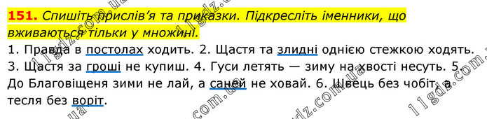 Спишіть прислів’я та приказки. Підкресліть іменники, що вживаються тільки у множині. 1. Правда в постолах ходить. 2. Щастя та злидні однією стежкою ходять. 3. Щастя за гроші не купиш. 4. Гуси летять — зиму на хвості несуть. 5. До Благовіщеня зими не лай, а саней не ховай. 6. Швець без чобіт, а тесля без воріт.