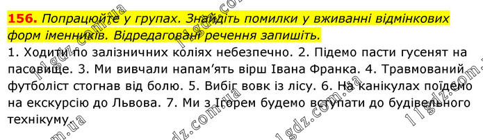 Попрацюйте у групах. Знайдіть помилки у вживанні відмінкових форм іменників. Відредаговані речення запишіть. 1. Ходити по залізничних коліях небезпечно. 2. Підемо пасти гусенят на пасовище. 3. Ми вивчали напам’ять вірш Івана Франка. 4. Травмований футболіст стогнав від болю. 5. Вибіг вовк із лісу. 6. На канікулах поїдемо на екскурсію до Львова. 7. Ми з Ігорем будемо вступати до будівельного технікуму.