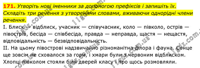 Утворіть нові іменники за допомогою префіксів і запишіть їх. Складіть три речення з утвореними словами, вживаючи однорідні члени речення. І. Блиск — відблиск, учасник — співучасник, коло — півколо, острів — півострів, бесіда — співбесіда, правда — неправда, щастя — нещастя, відповідальність — безвідповідальність. II. На цьому півострові надзвичайно різноманітна флора і фауна. Сонце ще зовсім не сховалося за гори, і хмари були з червоним відблиском. Хлопці півколом стояли біля дверей класу ї про щось розмовляли.