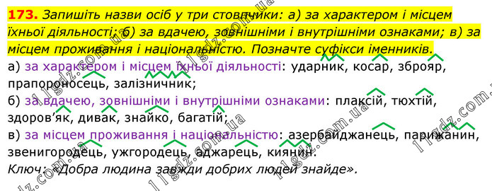 Запишіть назви осіб у три стовпчики: а) за характером і місцем їхньої діяльності; б) за вдачею, зовнішніми і внутрішніми ознаками; в) за місцем проживання і національністю. Позначте суфікси іменників. а) за характером і місцем їхньої діяльності: ударник, косар, зброяр, прапороносець, залізничник; б) за вдачею, зовнішніми і внутрішніми ознаками: плаксій, тюхтій, здоров’як, дивак, знайко, багатій; в) за місцем проживання і національністю: азербайджанець, парижанин, звенигородець, ужгородець, аджарець, киянин. Ключ: «Добра людина завжди добрих людей знайде».