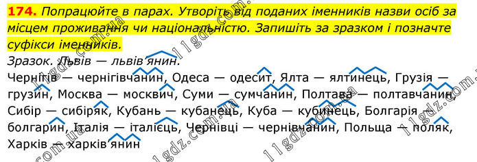 Попрацюйте в парах. Утворіть від поданих іменників назви осіб за місцем проживання чи національністю. Запишіть за зразком і позначте суфікси іменників. Зразок. Львів — львів’янин. Чернігів — чернігівчанин, Одеса — одесит, Ялта — ялтинець, Грузія — грузин, Москва — москвич, Суми — сумчанин, Полтава — полтавчанин, Сибір — сибіряк, Кубань — кубанець, Куба — кубинець, Болгарія — болгарин, Італія — італієць, Чернівці — чернівчанин, Польща — поляк, Харків — харків’янин