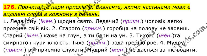 Прочитайте пари прислів’їв. Визначте, якими частинами мови є виділені слова в кожному з речень. 1. Ледачому (імен.) щодня свято. Ледачий (прикм.) чоловік легко проживе свій вік. 2. Старого (прикм.) горобця на полову не зловиш. Старий (імен.) каже на глум, а ти бери на ум. 3. Тихого (імен.)та смирного і кури клюють. Тиха (прикм.) вода греблю рве. 4. Мудру (прикм.) річ приємно слухати. Мудрий (імен.) не дасться за ніс водити.