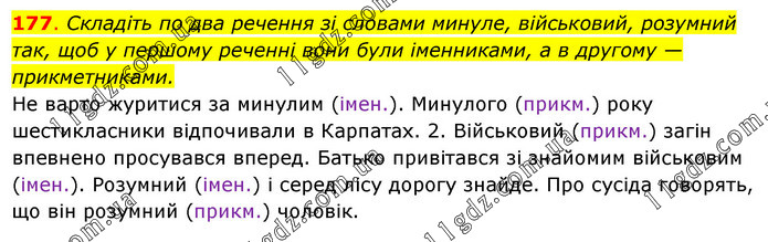 Складіть по два речення зі словами минуле, військовий, розумний так, щоб у першому реченні вони були іменниками, а в другому — прикметниками. Не варто журитися за минулим (імен.). Минулого (прикм.) року шестикласники відпочивали в Карпатах. 2. Військовий (прикм.) загін впевнено просувався вперед. Батько привітався зі знайомим військовим (імен.). Розумний (імен.) і серед лісу дорогу знайде. Про сусіда говорять, що він розумний (прикм.) чоловік.