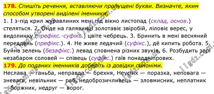 178. Спишіть речення, вставляючи пропущені букви. Визначте, яким способом утворені виділені іменники. 1. І з-під крил журавлиних мені під вікно листопад (склад, основ.) стеляться. 2. Онде на галявинці золотавіє звіробій, ліловіє верес, у видолинку (префікс.-суфікс.) цвіте чебрець. 3. Бринить в мені весняний переддень (префікс.). 4. Не живе ледачий (суфікс.), дё кипить робота. 5. Буйна зелень (безафікс.) левад сповнена різних звуків. 6. Розбудить зорі незабаром соловей — співець (суфікс.) гаїв понаддніпрових. 179. До поданих іменників доберіть із довідки синоніми. Неслава — ганьба, неправда — брехня, Неуспіх — поразка, неповага — зневага, невільник — раб, недоброзичливець — зловмисник, неплатник — боржник, недруг — ворог.