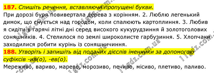 187. Спишіть речення, вставляючи пропущені букви. При дорозі буря повивертала дерева з корінням. 2. Люблю легенький димок, що снується над городом, коли спалюють картоплиння. 3. Любив я сидіти в гарячі літні дні серед високого кукурудзиння й золотоголових соняшників. 4. Стелилося по землі широколисте гарбузиння. 5. Хлопчаки заходилися робити курінь із соняшничиння. 188. Утворіть і запишіть від поданих дієслів іменники за допомогою суфіксів -ив(о), -ев(о). Мереживо, вариво, марево, морозиво, печиво, місиво, плетиво, паливо.