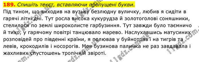 Спишіть текст, вставляючи пропущені букви. Під тином, що виходив на вузьку безлюдну вуличку, любив я сидіти в гарячі літні дні. Тут росла висока кукурудза й золотоголові соняшники, стелилося по землі широколисте гарбузиння. Тут завжди було таємничо й тихо, у гарячому повітрі танцювало марево. Наслухавшись матусиних розповідей про південні країни, я полював у буйнотрав’ї на тигрів та левів, крокодилів і носорогів. Моя бузинова паличка не раз завдавала і жахливих спустошень тропічній звіроті.