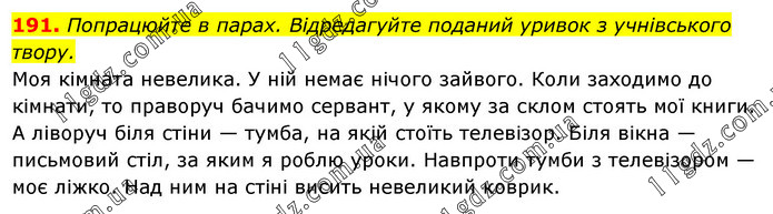 Попрацюйте в парах. Відредагуйте поданий уривок з учнівського твору. Моя кімната невелика. У ній немає нічого зайвого. Коли заходимо до кімнати, то праворуч бачимо сервант, у якому за склом стоять мої книги. А ліворуч біля стіни — тумба, на якій стоїть телевізор. Біля вікна — письмовий стіл, за яким я роблю уроки. Навпроти тумби з телевізором — моє ліжко. Над ним на стіні висить невеликий коврик.